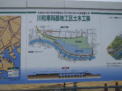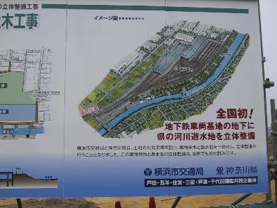 | 4号線の車庫になる川和車両基地でも工事が始まりました。 | 鶴見川の河川遊水地と立体整備されるようです。 |