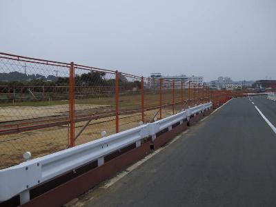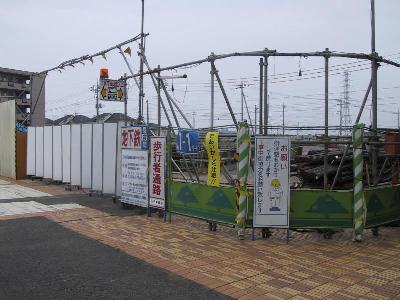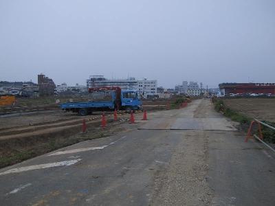 | 車両基地だけあって、とても広いです。敷地が延々と続いています。 | 工事用車両が横断する仮設道路もあります。 |