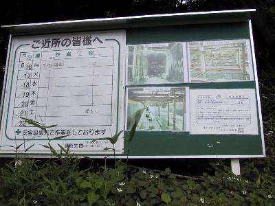 | 葛ヶ谷公園入口付近に立っている掲示板です。作業工程には埋め戻し作業と記述されています。こちらもシールドマシンが入り、センター南に向けて掘削が開始された ものと思われます。 | |