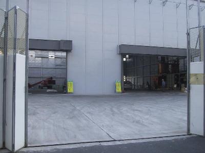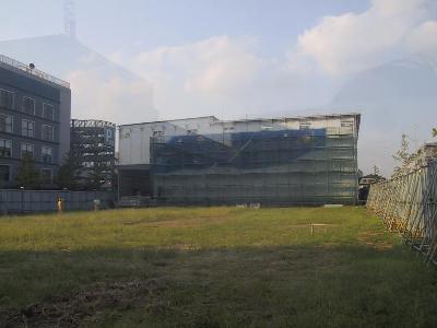 | 柵の中にはご覧のような建物が立っています。 | 建物の裏側に回ってみました。ここが入口のようです。 おそらく、ここからシールドマシンで掘削した土砂を運び出している ものと思われます。 |