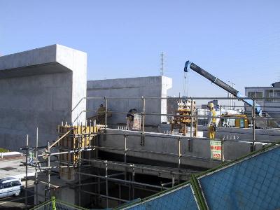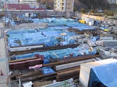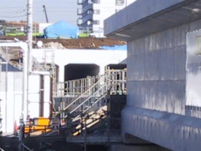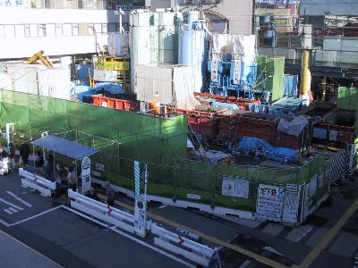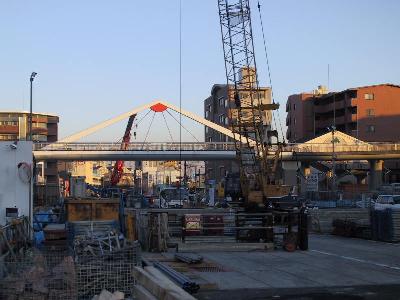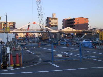 | 駅前の陸橋から | 少し望遠で近づいてみます。かなり多くの重機が入っていて 工事たけなわといった感じです。 |