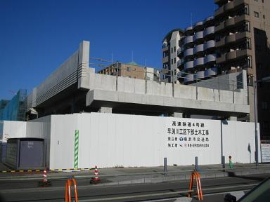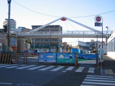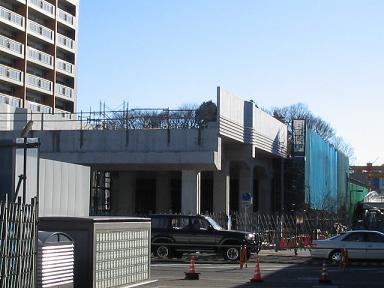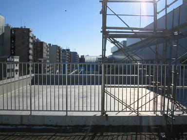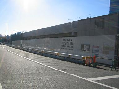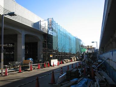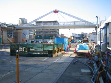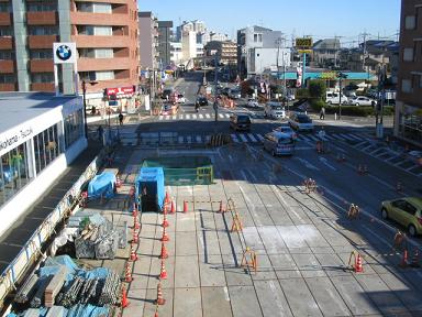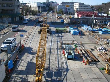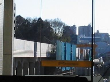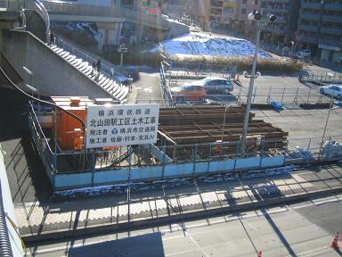 | 上に写っている歩道橋から日吉方面を眺めます。 人口路盤でふさがれていて整然としていますが、この下では ホームの工事が進められています。 |