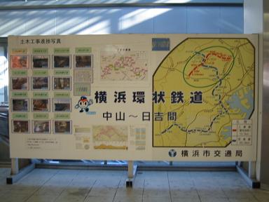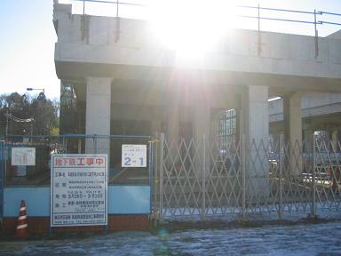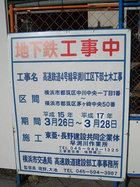 | 日吉方から北山田駅方面を眺めています。 | 地下鉄工事の看板が見えています。 |