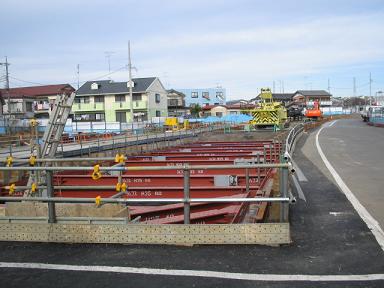 | さらに先に進みます。クレーンも入っています。 | 1度川和町方面を振り返ります。鉄骨の下に地下鉄が走ります。 |