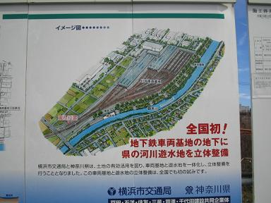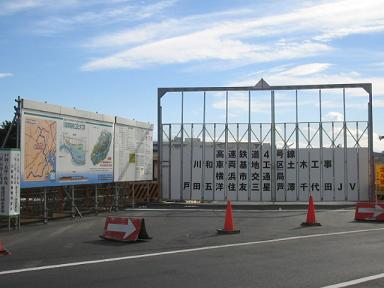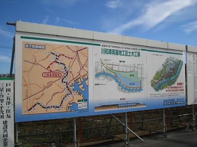 | 川和車両基地になる場所です。 | 川和車両基地土木工事の看板です。 |