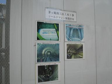 | シールドマシンの絵が描いてあります。 | 歩道橋を渡ったところにおかしな形のテントがあります。以前 掘り返していたところですが、工事が終ったようです。 手前の白いものは大晦日に降った雪が残っています。 |