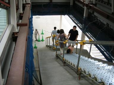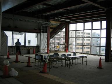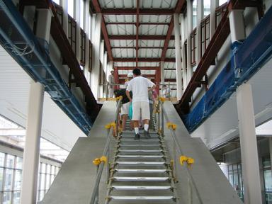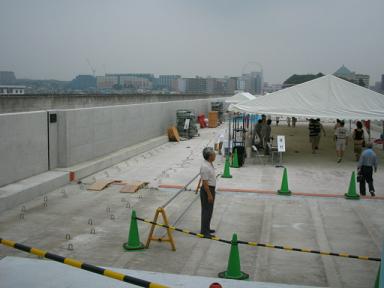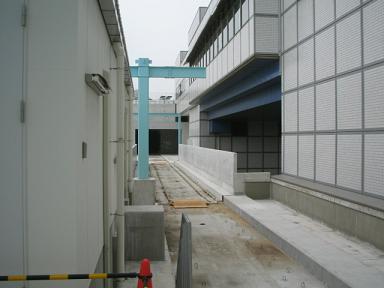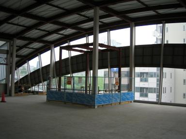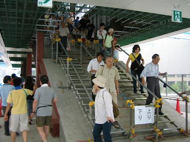 | それでは、右上の反対側にある階段から降りていきます。 まだスロープだけで階段は作られておらず、工事用のステップが 設けられています。 |