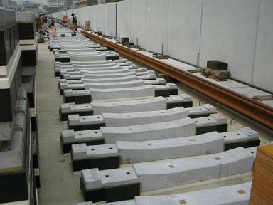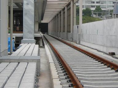 さらに、センター北駅に近づいてみます。4号線は都営大江戸線同様 リニア式地下鉄なのですが、線路中央のリアクションプレートは まだ設置されていません。 |