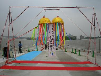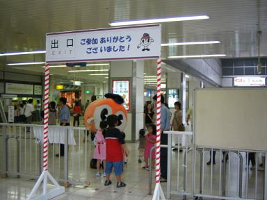 | 出口になります。ハマリンも見送りにきています。 | 渡り初めに参加した人から先着500名に港北阪急の屋上にある 観覧車の無料券が配られました。 |