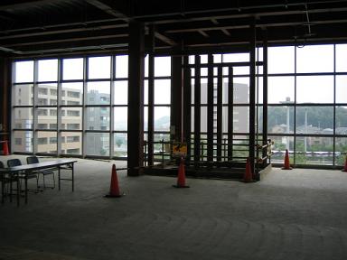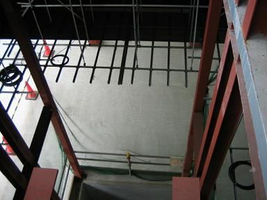 | エレベーターが設置される穴から下を見ています。 | ここは階段になるところです。 |