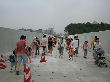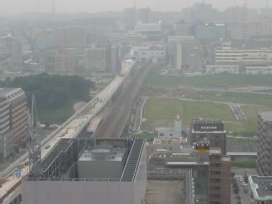 | ということで、観覧車からの眺めです。この日はあいにく、曇り空の 上、視界不良でしたが、今、歩いてきたセンター北−センター南間の 高架橋はしっかりと見えました。 |