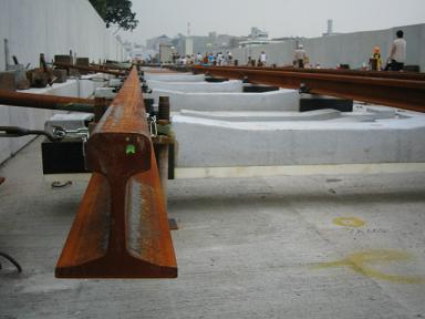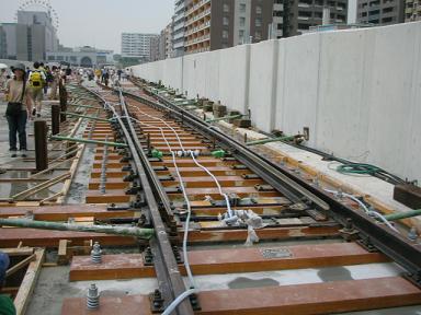 | 係りの人の案内によるとここは中線になるとのことです。 | まだすべての枕木が固定されているわけではなく、 部分、部分のみ固定されいます。いわば仮止めです。 |