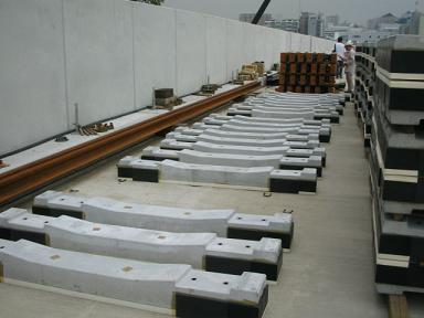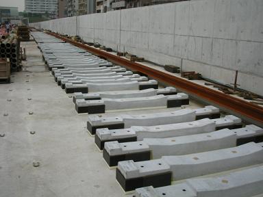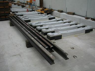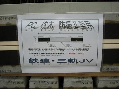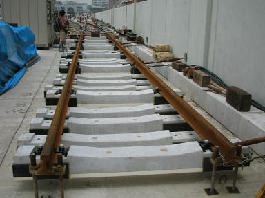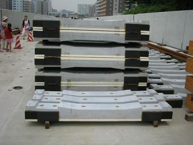 | 一部線路も置かれています。まもなく敷設です。 | PC枕木 左下の説明にもありますが、サイドの黒色の部分は ゴムになっており、騒音や揺れを防止します。 |