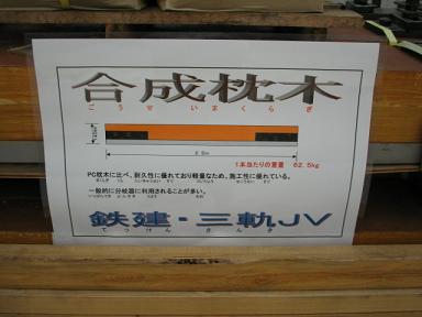 合成枕木の解説。合板(木製)の枕木になります。コンクリート製の PC枕木に比べ加工性に優れ、ポイント部分に多く使用されます。 |
