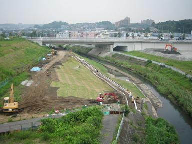 | 望遠で、さらに先を見ています。 | 高架橋の東側の景色です。下を流れるの鶴見川の支流の早淵川です。 |