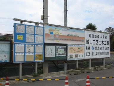 | 道路の反対側でも工事が進んでいます。 北山田駅出入口等整備工事の看板も見えます。 |