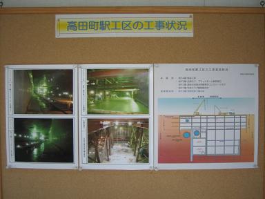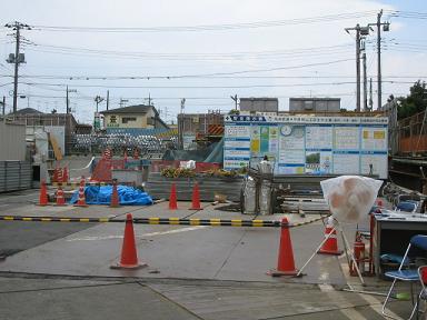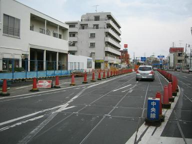 | ちょうど道路の下が駅になるため車線が大きく変わっています。 | 高田町駅工区 |