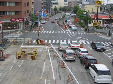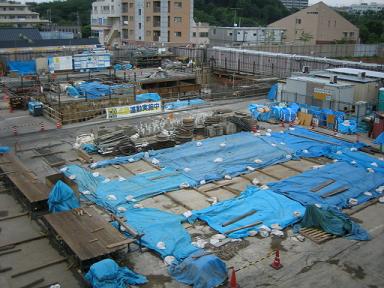 | 歩道橋に上って、センター北方面をみています。 青いビニールシートだらけですが、この下で駅舎の工事が 進んでいると思われます。 |