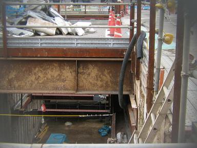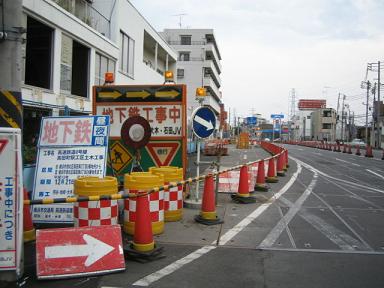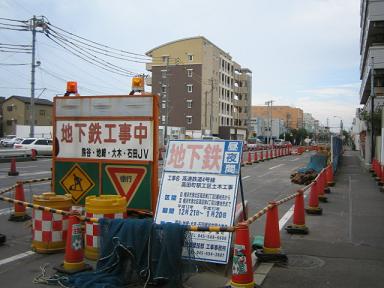 | 道路に沿って工事区間が続きます。 | 地下鉄の出入口になるのかそれとも駅の開口部になるのか 大きな穴があいています。 |