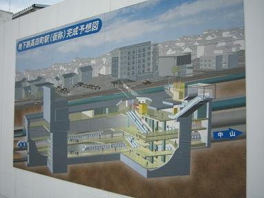 | 東山田に向かって左側のマンション建設現場にあったイラスト 北山田駅の完成予想図が描かれています。 このマンション駅に直結するらしいです。 |