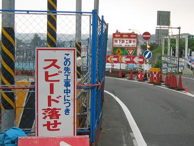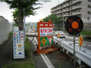 | この付近から再び、地下鉄工事のため車線規制になります。 | みんなの地下鉄! 路線図が描かれた看板が架かっています。 |