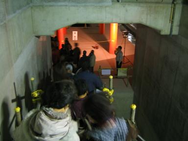 | 細めの階段を上がります。 | かなり狭い通路です。よく分かりませんが、ここは開業後、 正規の出入口ではなく緊急用の出入口になるような感じです。 |