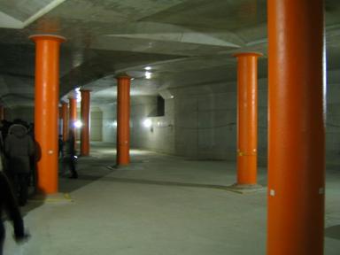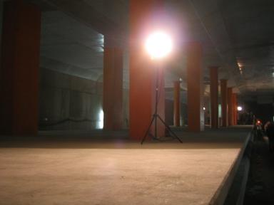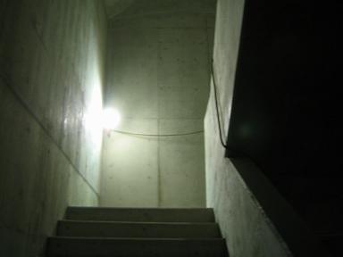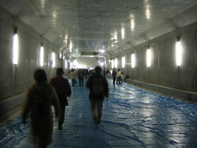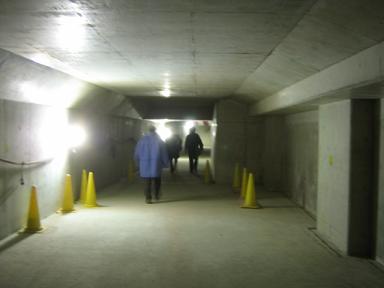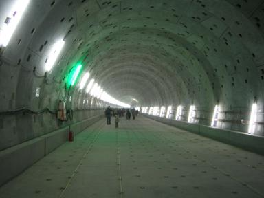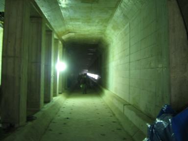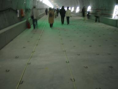 | 先の方が少し右カーブしています。 距離感がなくならないためか、ところどころに色付き蛍光灯が 設置されています。 |
