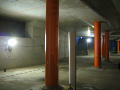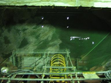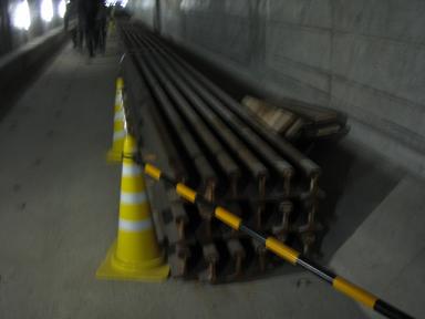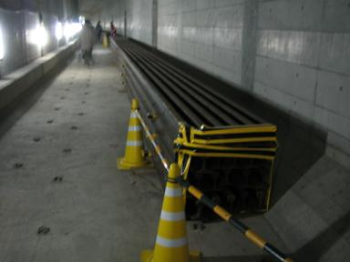 | トンネル上部です。各セグメントに無数の穴があいています。 | 地面の様子です。 ロープの部分に線路が敷設される見込みです。 |