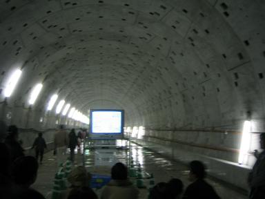 | トンネル中間地点には工事の様子を紹介したビデオが 上映されていました。 |