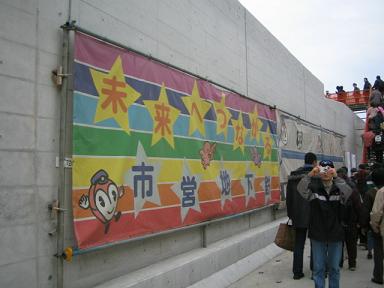 | はまりんと動物たちが乗った地下鉄が描かれた横断幕が 貼られています。今回のトンネルウォークはここが終点です。 |