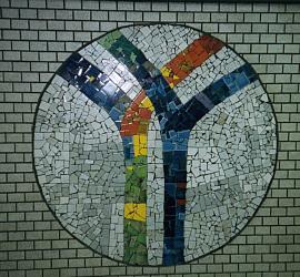 | 関内駅出入口 | コンコースのシンボルマークのタイル。 横浜駅のものとは色が異なる。 |