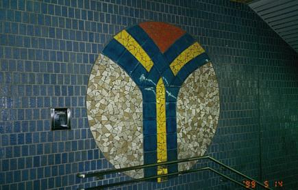 コンコースへ降りる階段の壁面 にある、市営地下鉄のシンボル マーク。 |