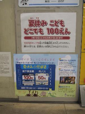2003年7月19日(土)〜8月31日(日)までの夏休み期間中。子供は地下鉄全線100円。市営バスは50円で乗ることができます。地下鉄では、100円の切符を購入。降りるときに、有人改札口を出るという仕組みです。