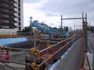 | 上の写真の個所(394〜390号橋脚)では先週から特に目立った変化はなかった。ちなみにこの工区の担当は豊洲の地元企業IHI(石川島播磨重工業)が請け負っている。 | |