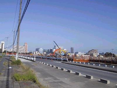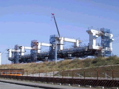 ←先週と同じ桁です。(393−392) /こちらは、今週できた桁です。(391−390) ↓全体はこんな感じです。 5本の橋脚(植木算式で間は4つ)のうち、現在、2区間の桁の 姿が現れました。どちらも、比較的距離の近い橋脚間です。 残りは、一番豊洲駅前交差点寄りの区間と、 横断歩道のあるやや間隔の広い橋脚間が残ってます。 (←の写真の桁と、↓の写真の桁を結ぶ区間です。) |