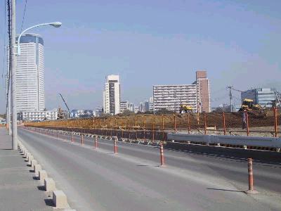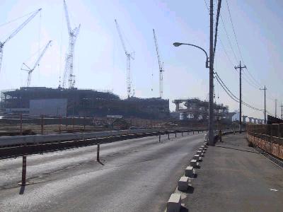 左の写真の地点から後ろを振り返り、豊洲方面を望む。 整地作業がかなり進み、もうしばらくすると、ゆりかもめの橋脚設置 工事も始まってくると思われる。 |