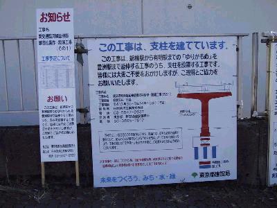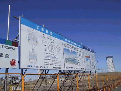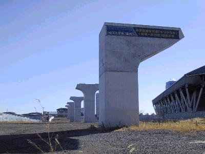 | 5番目の橋脚のアップです。まだ背が高くなっていません。 | 付近にある看板です。来年の3月まで計9本の支柱を立てる工事が 行われると書かれています。 |
