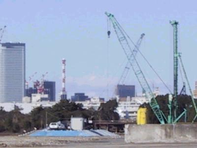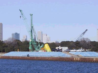 | 4本目を別角度から こちらもまだ埋め戻されていません。 | やや角度を変えて、豊洲駅方面を眺めます。 4本の橋脚と奥に箱型になった橋梁を見ることができます。 |