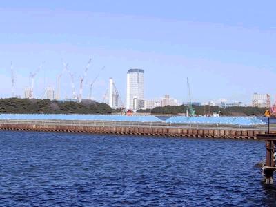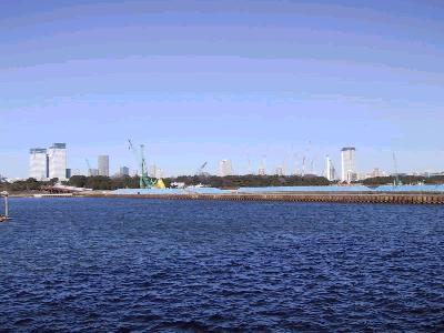 全体を眺めてみます。この広い東雲運河は半分くらいまで 埋立てられます。その埋立地に有明北駅が出来る予定に なっています。ここが完成するのはまだ少し先になりそうです。 |