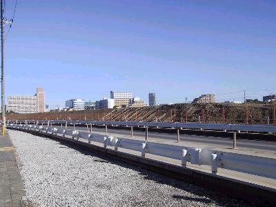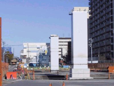 | 豊洲(2)駅から豊洲(1)駅までの間にはご覧のような 9本の橋脚がすでに完成しています。 奥に見えている駅が豊洲(2)駅です。手前が豊洲(1)駅になります。 |