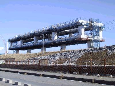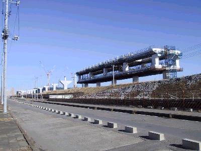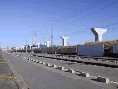 | 現在の終点である有明をでるとその先には5本の橋脚が すでにできています。奥に見えているのが有明駅です。 |
