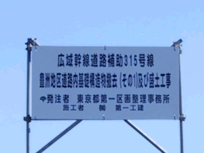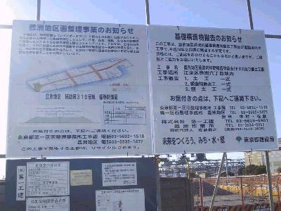 | 上にある5番目の橋脚から振り返ったところにある看板です。 この先はゆりかもめの工事に入る前段階で、豊洲(2)駅まで、 まず道路の整備が行われる区間になります。この工事は2002年2月に 完成する予定です。 |