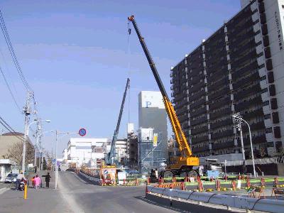 | こちらも、高いクレーンが入っての作業が始まってます。 | 4本プラス低い橋脚1本は見た目には変化はありません。 |