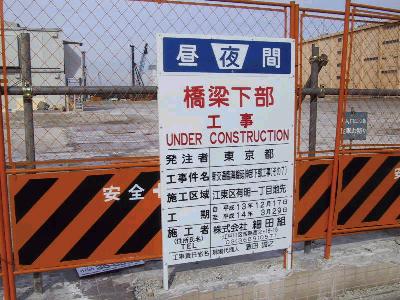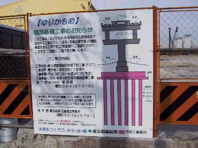 | いよいよ、【ゆりかもめ】基礎橋脚工事の看板が立てられました。 | 左の看板の隣にたってます。 |