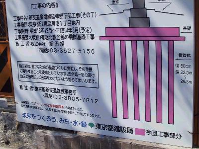 以前にも載せた看板ですが、一応、3月までで、工事が終了する予定 になっています。すべてが地下の基礎部分なので、見えないのは 当然ですが、すでに、この下にできてるのでしょうか? |