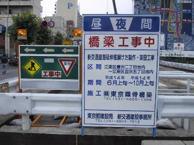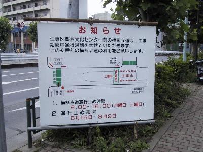 | 豊洲駅前交差点に立っている看板 | 工事の影響で一部通行止めになっています。 |