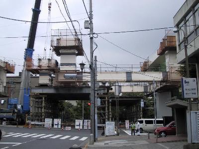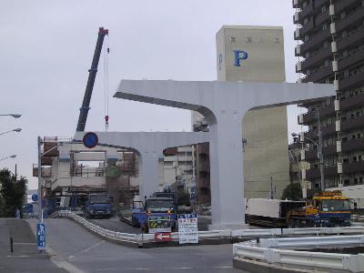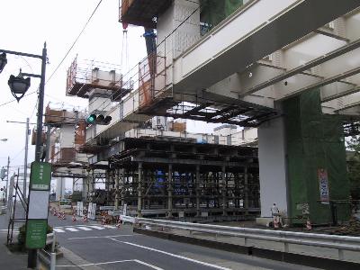 | 先週までは下のグレーの部分の仮受け台しかできて いませんでしたが、今週は、その上の橋梁部分ができてきました。 |
