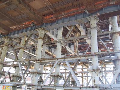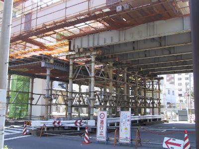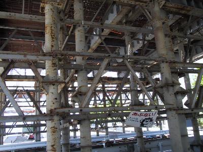 | 前回書きましたが、歩行者は通れるようになりました。こんな鉄骨だらけの中に横断歩道があります。 | |