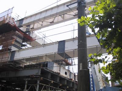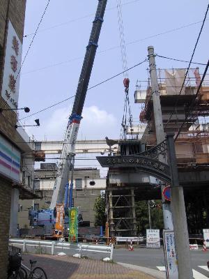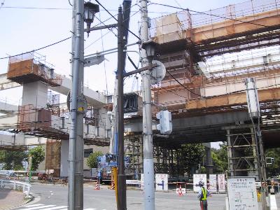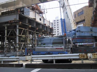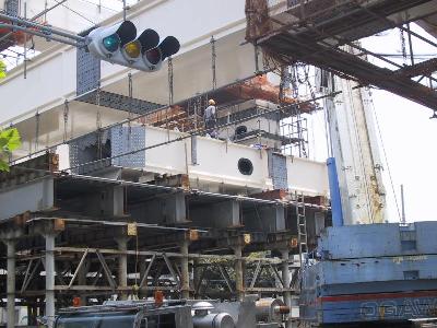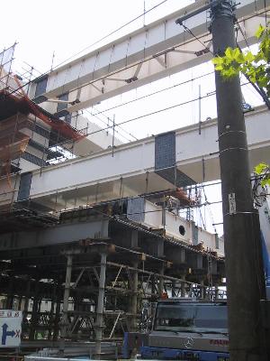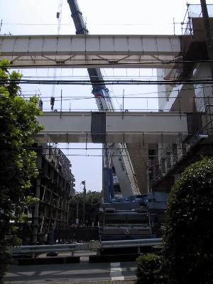 | 工事の人が立っている桁は、これから90度回転して、 向こう側に渡されます。 |