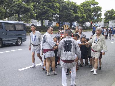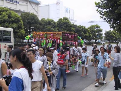 | 今日はちょうどお祭りの日で、取材の途中に、子供の曳く、山車とお神輿に出会いました。 | |